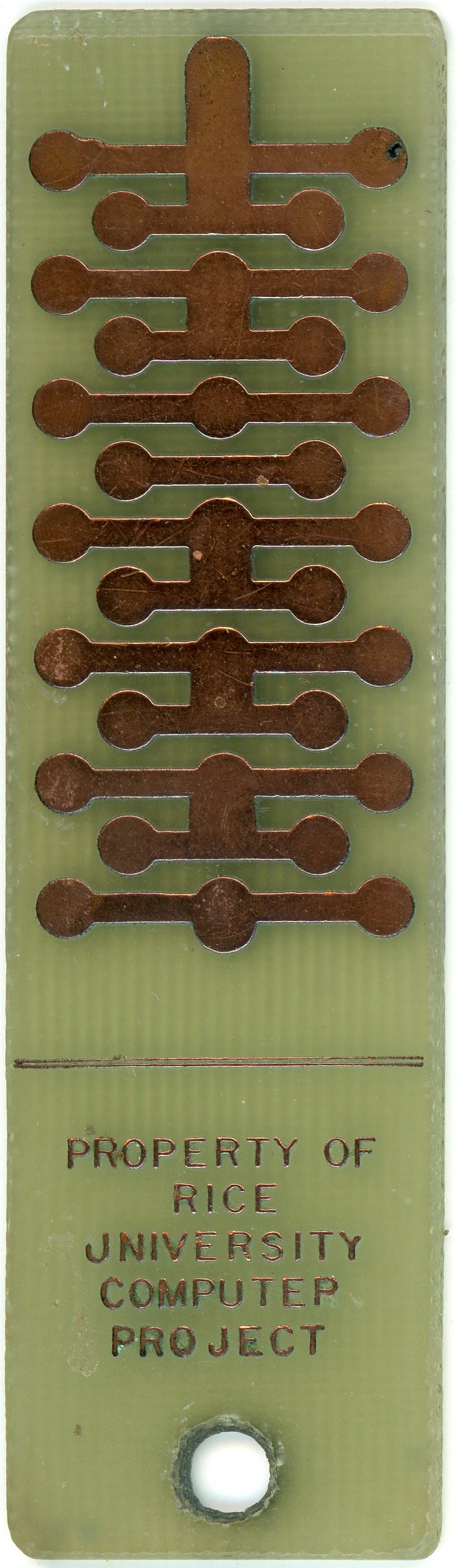 "A user would sign up for a ten-minute block of computer time; this is another reason that graduate students would tend to work in the middle of the night, when they could use the machine uninterrupted for long periods. Verification was handled in an interesting manner: a user would get a "key"--a printed circuit board whose characteristics allowed determination of who was using the machine. Insertion of this key into a slot would cause a paper tape to be punched, so a log of machine use could be produced.